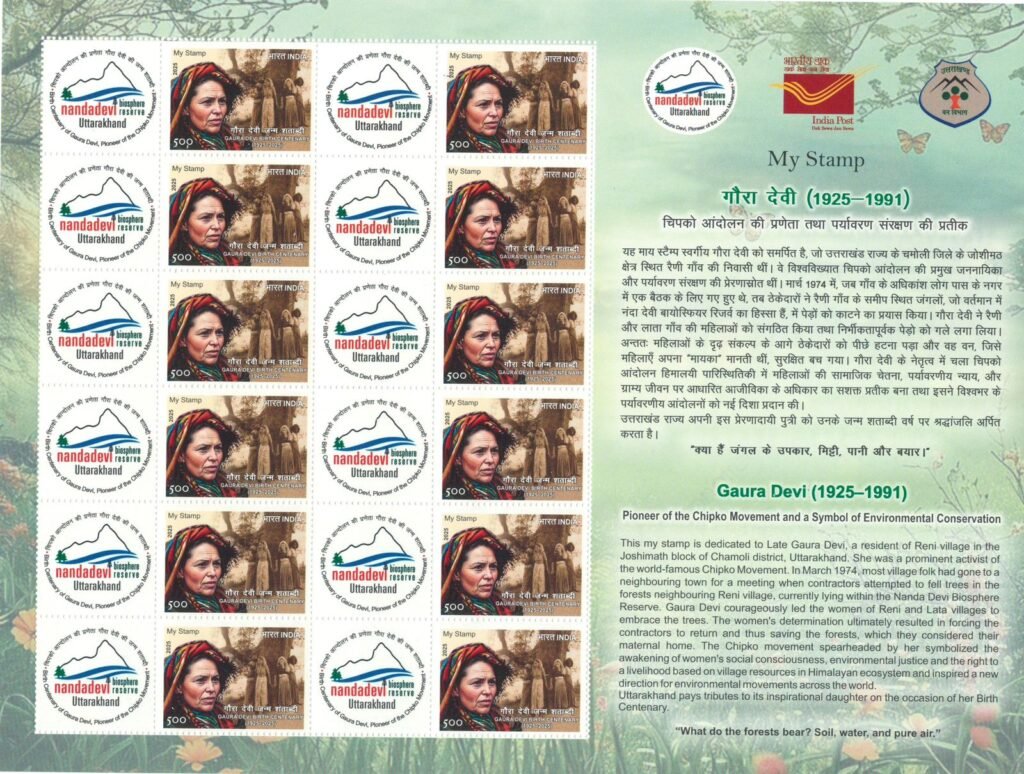 चिपको नेत्री गौरा देवी की 100 वीं जयंती रैणी गांव में धूमधाम से मनाई गई। बतौर मुख्य अतिथि वन मंत्री सुबोध उनियाल ने पौधरोपण कर गौरा देवी को याद किया। इस दौरान डाक विभाग की ओर से गौरा देवी के योगदान को जन-जन तक पहुंचाने के लिए डाक टिकट जारी करने के साथ ही विशेष आवरण का विमोचन भी किया गया।