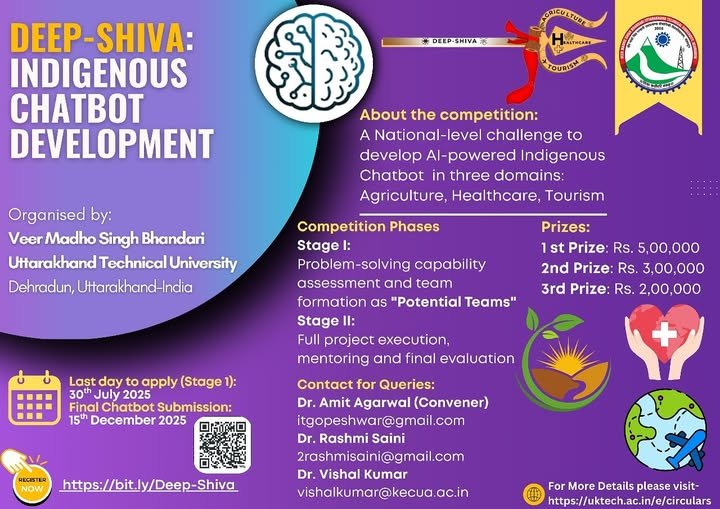 वीर माधो सिंह भंडारी उत्तराखंड प्रौद्योगिकी विश्वविद्यालय डीपशिवा चैटबोट बना रहा है। यह कृषि, पर्यटन और स्वास्थ्य सेवाओं की जानकारी देगा। राज्यपाल की प्रेरणा से यूटीयू ने राष्ट्रीय प्रतियोगिता शुरू की है। चैटबोट का उद्देश्य हिंदी समेत भारतीय भाषाओं में संवाद करना है। यह एआई आधारित प्रणाली भारत की प्रगति को दिखाएगा। सर्वश्रेष्ठ चैटबोट बनाने वालों को राज्यपाल पुरस्कार देंगे।
